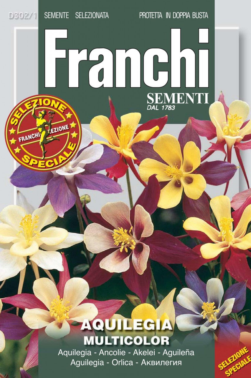 Columbine Multicolor Mix - Aquilegia Franchi Special Selection. Pretty mix of delicate flowers with very long spurs. 60 cm tall. Annual. Prefers light shade and moist soil, but will do well in sun if given plentiful water. Beautiful in a rock garden or a wooded setting. Set seeds out in spring uncovered. Space 12". If growing transplants, sow in pots, put pots in refrigerator a week or two, then grow at 70 degrees. 1 gram packet.
