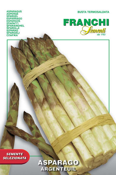 Arparagus Precoce d'Argenteuil. Early. Light green big spears with purplish scales. Asparagus beds produce for 20 or more years. Easy to grow; rust resistance. These are seeds; USDA will not allow import of root stock. Starting from seed means it takes an additional year to get your bed productive. To start plants, sow seed in a small furrow; place seeds 1 inch deep; space rows 12 inches. Thin to 5 inches. The next year, move them to a permanent bed. Make sure you have prepared the area well (dug deep, made any soil amendments). 2.5 gram packet.
