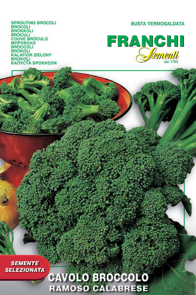Broccoli of Calabria. Traditional variety from Southern Italy. Compact. Early with a medium-sized head which is 4-5 inches across. Vigorous producer of large side shoots which form after main head is cut. If you let it produce side shoots, space it at 24 inches since the plant gets huge. Nice sweet taste, tender shoots. Good for both spring and fall planting, but the heads grow best in cooler weather. 55-60 days. 6 gram packet, approximately 1,575 seeds. Approximately 315 seeds per gram.