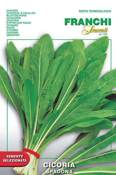 Chicory Spadona. Cutting chicory for salads. Long leaves, very thin, almost non-existent stem. Leaves are rounded and smooth without any serration. Fast grower - 30 days to early cutting. Will regrow after cutting but it is just as easy and the quality is higher if you succession sow. Broadcast sow in a prepared bed from three weeks before first frost. Make new plantings every three weeks or so. Will take fairly strong frosts. 10 or 30 gram packet. Approximately 600-900 seeds per gram.