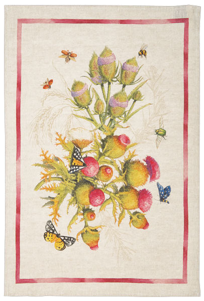 Native to the Mediterranean region, Cynara cardunculus, or thistle is the centerpiece of this towel design showing happy pollinators and featuring beautiful colors.