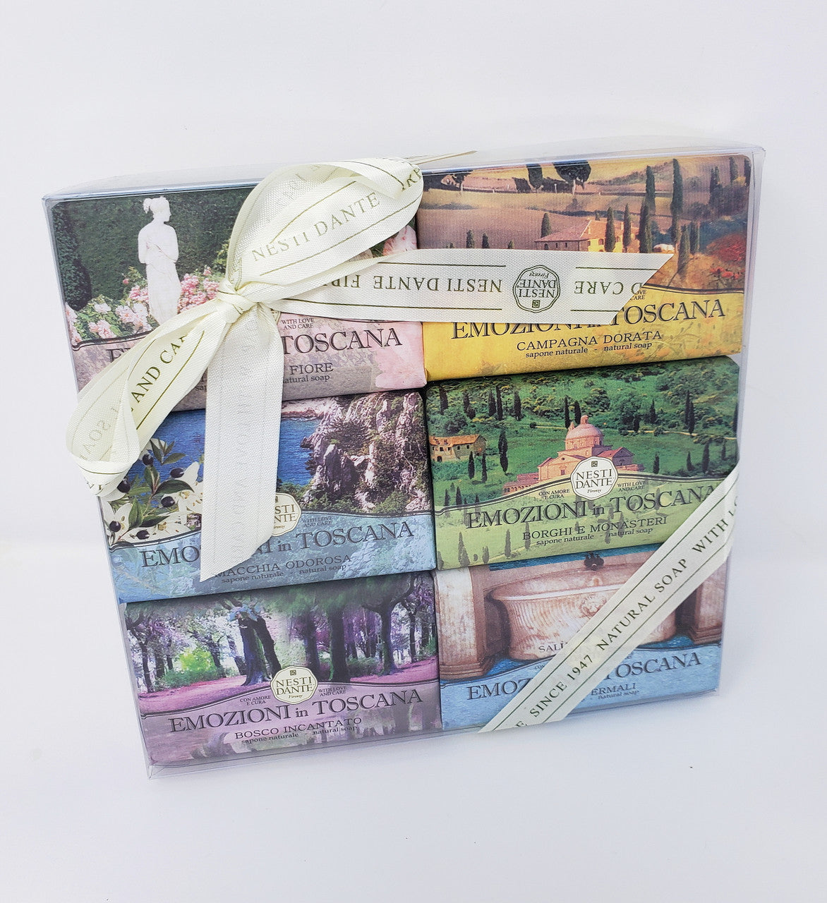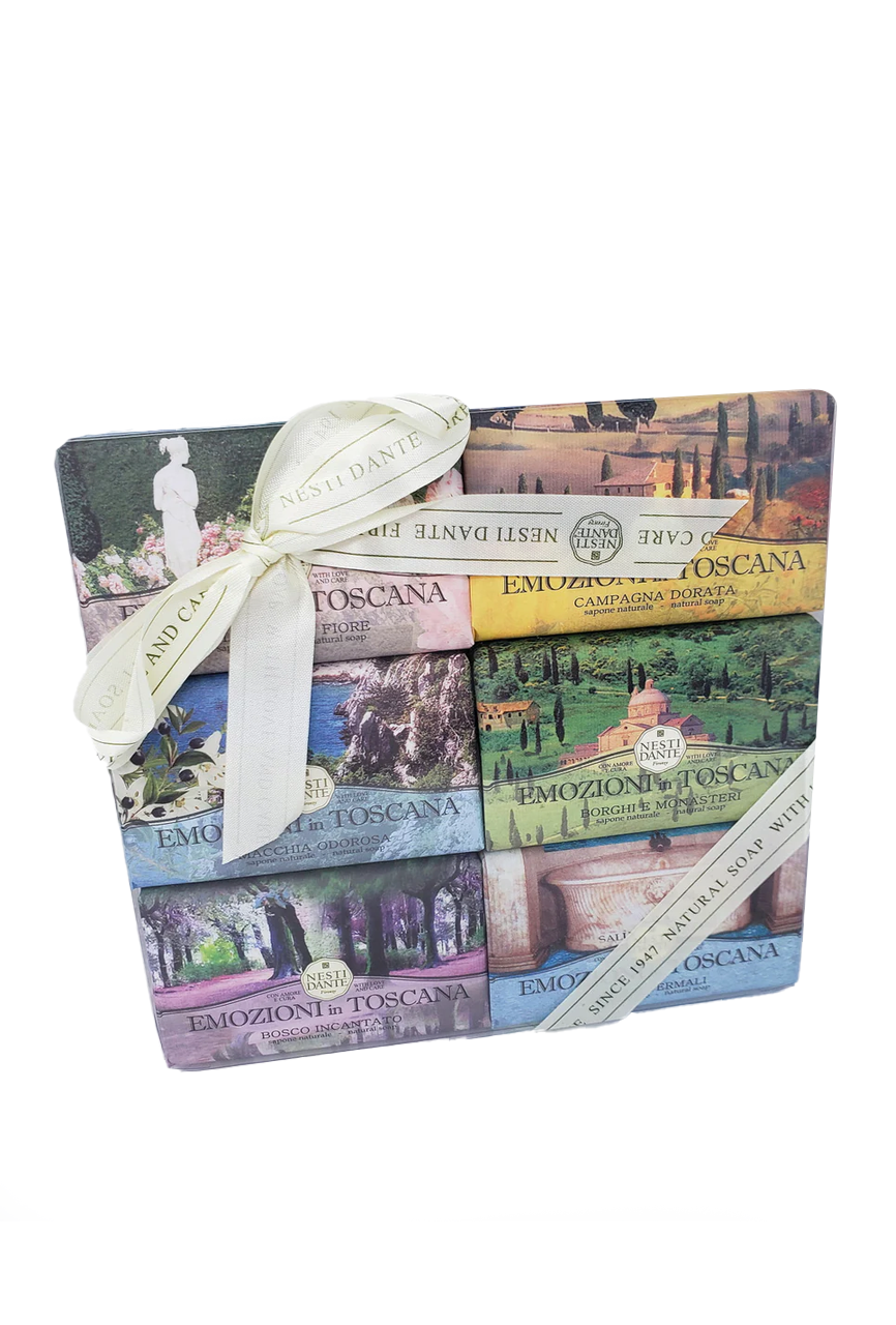 An aromatic journey through the emotions that only Tuscany could inspire. Six 5.3 oz bars each with an individual scent. They are packaged in a transparent box ornamented with a Nesti Dante ribbon for an elegant gift ready to present. Each individual bar depicts a classic Tuscan landscape.