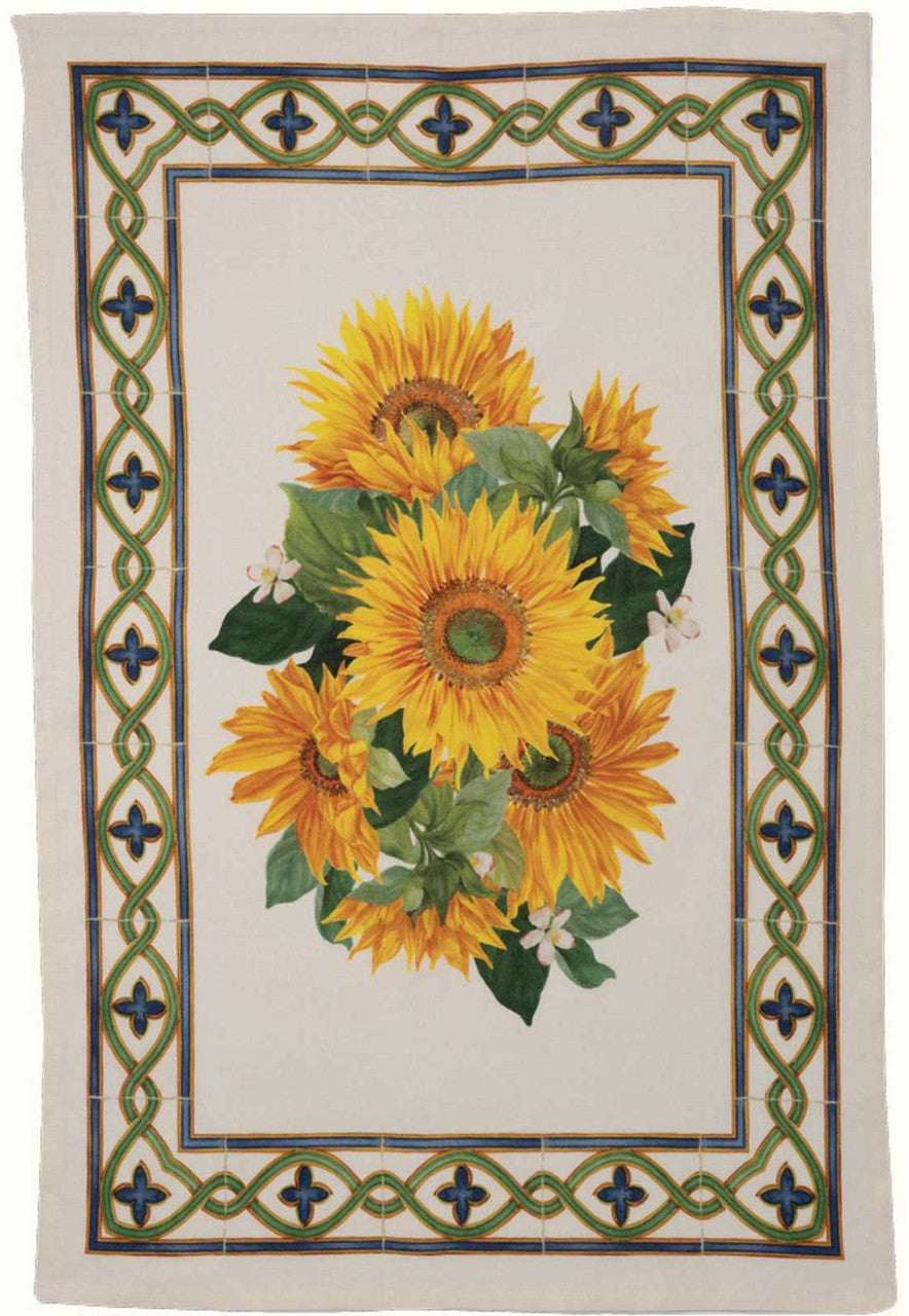 Tessitura Toscana Telerie is a wonderful linen company that makes all their products in Tuscany, Italy. These towels are beautiful enough to be wall art or sewn into kitchen curtains, but tough enough for regular use. As they are 100% linen, they're perfect for lint-free washing up. They make a unique hostess gift, or you can tuck one in with a gift of food or seeds. This towel features bright and charming sunflowers, tiny lemon flowers, and a colorful mosaic tile-inspired border. Part of our 10-year anniversary line of sunflower-themed gifts.