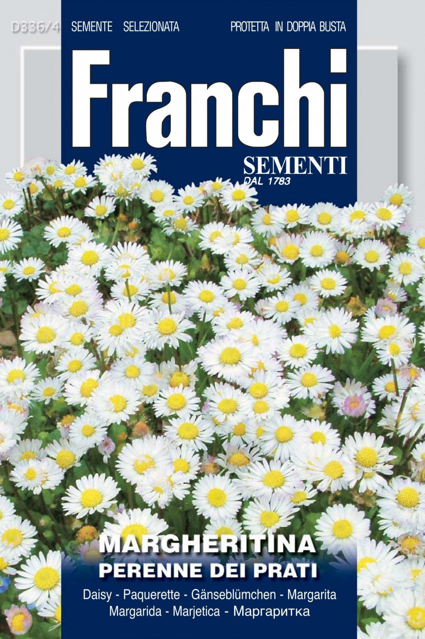 Perennial daisy. Pretty flowers bloom all year. Easy to grow. This is the daisy seen all over Europe in lawns & meadows. Start in flats, transplant to pots when big enough to handle. Set out spacing six inches. Prefers full to part sun. Likes lots of moisture. .4 gram packet.