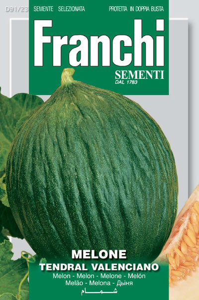 Melon Valencia. Oval fruit. Dark green skin, sweet white flesh. 4-4 1/2 pounds. Fairly late at 105 days from direct seed; 10 days less from transplants. 5 gram packet.
