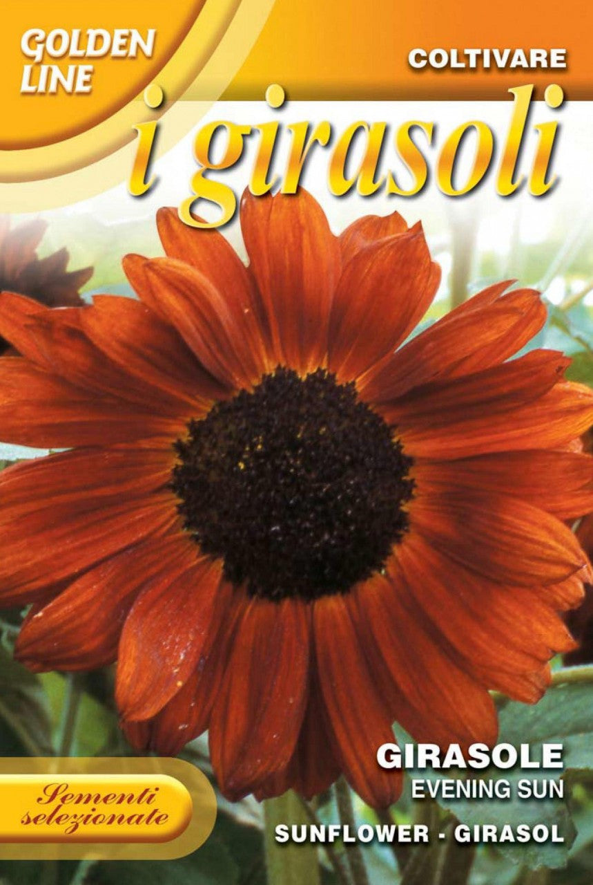 Evening Sun is a branching sunflower with deep reddish orange petals and dark center disk. 3 gram packet