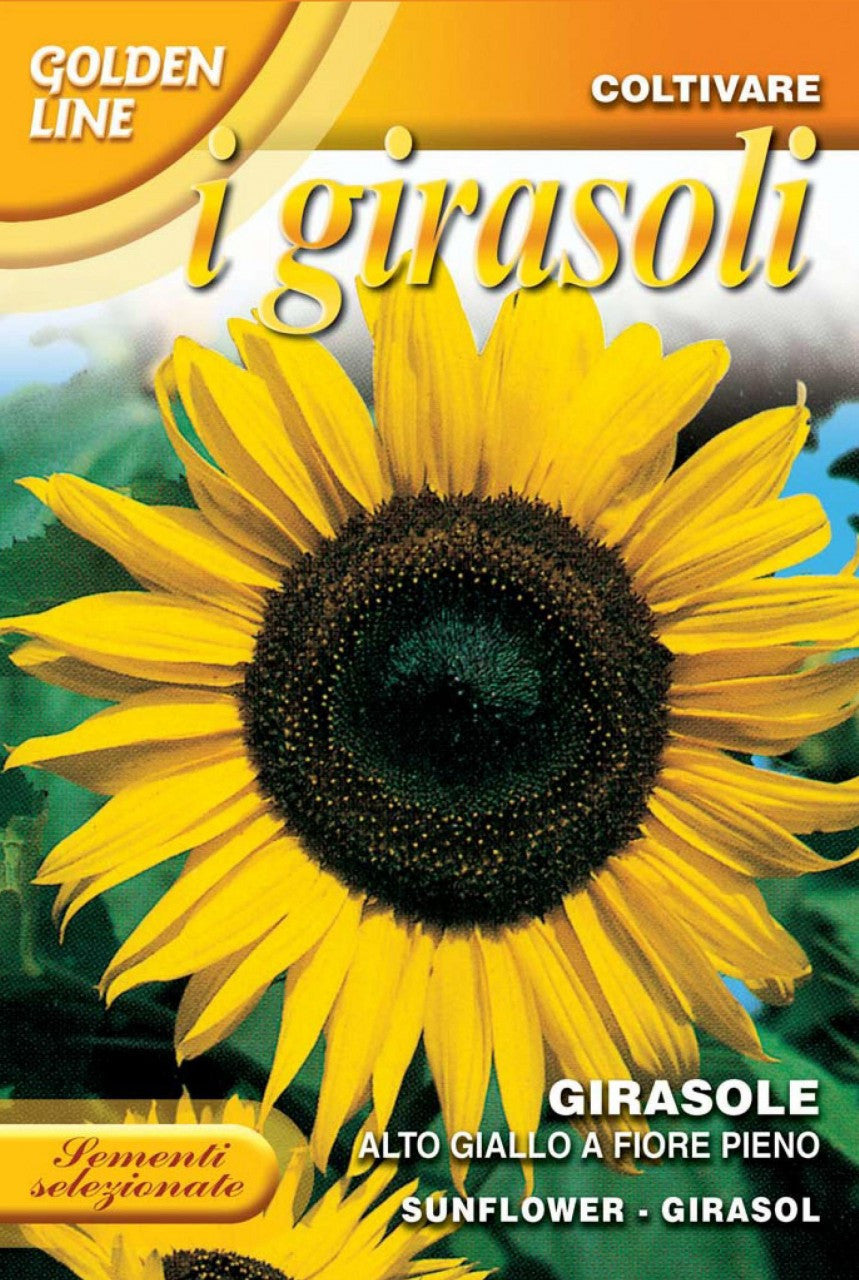 Sunflower - Girasole Alto Giallo a Fiore Pieno. Annual. Tall sunflower with yellow petals and brown center. Your yard will look like one of those sunflower fields in Tuscany. Five to six feet tall. 90 or so days. 5 gram pack. Direct seeding preferred; full sun. Space 12 inches. 4 gram packet.