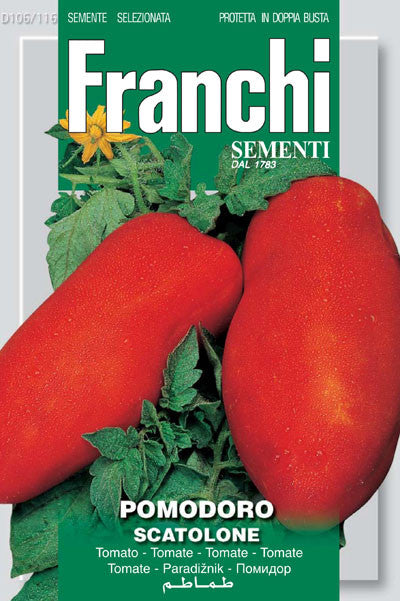 Scatalone means "Carton" and is so named because it can be picked pink and stored in a carton to ripen. Mid-late indeterminate. Heavy producer. A San Marzano type paste tomato from Lazio.