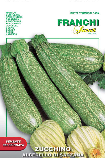 Zucchini Alberello di Sarzana - Little Tree of Sarzana. Light green fruit with white speckles. Some ribbing. Delicate flavor. Large plant, good producer over a long season; seems to have some resistance to powdery mildew. Many blossoms for cooking. 50-55 days. 8 gram packet; approximately 45-60 seeds. Approximately 2-10 seeds per gram.