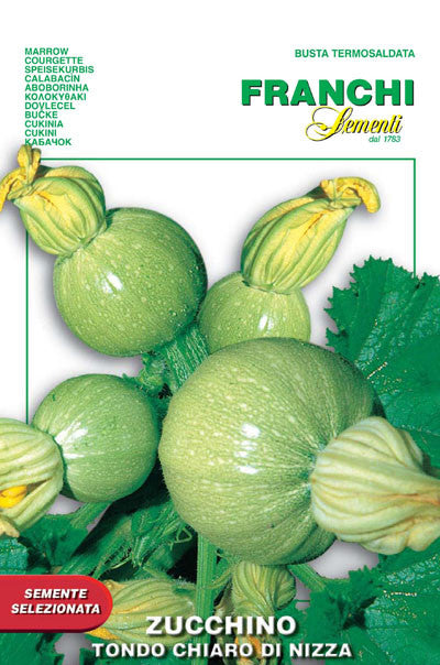 Zucchini Tondo Nizza - Round of Nice. Similar to Piacenza but light green rather than dark green. Very thin skin so handle carefully. Pick when no larger than a baseball or softball, before the skin begins to darken up. Grill, stuff, fry, use in parmigiana instead of eggplant. 55 days. 10 gram packet. Approximately 2-10 seeds per gram.