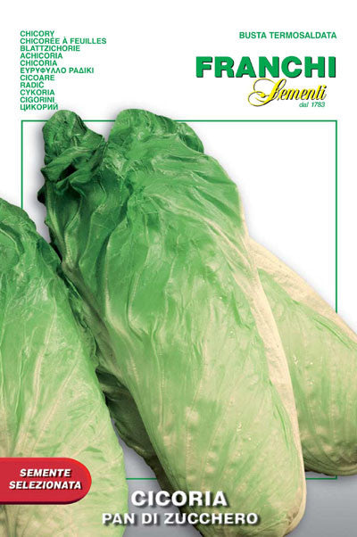 Radicchio Pan di Zucchero - Sugarloaf. Upright light green variety with large, long tight head. Easy to grow and easy to head up. For spring and fall. Popular throughout Italy. Use cooked or in salads. 10 gram packet.